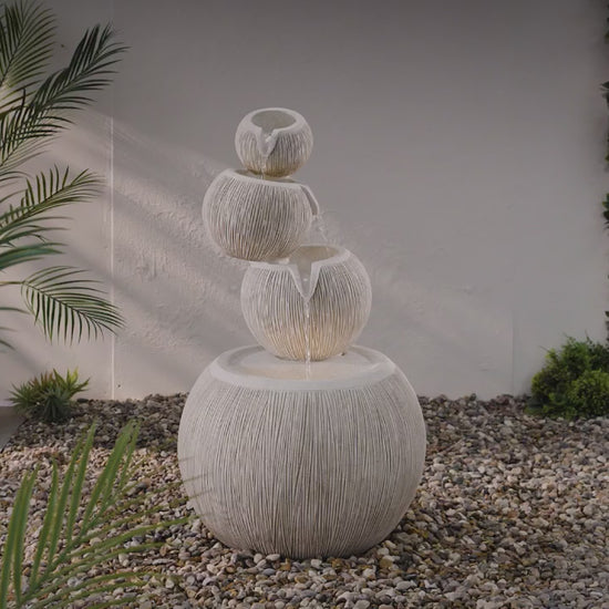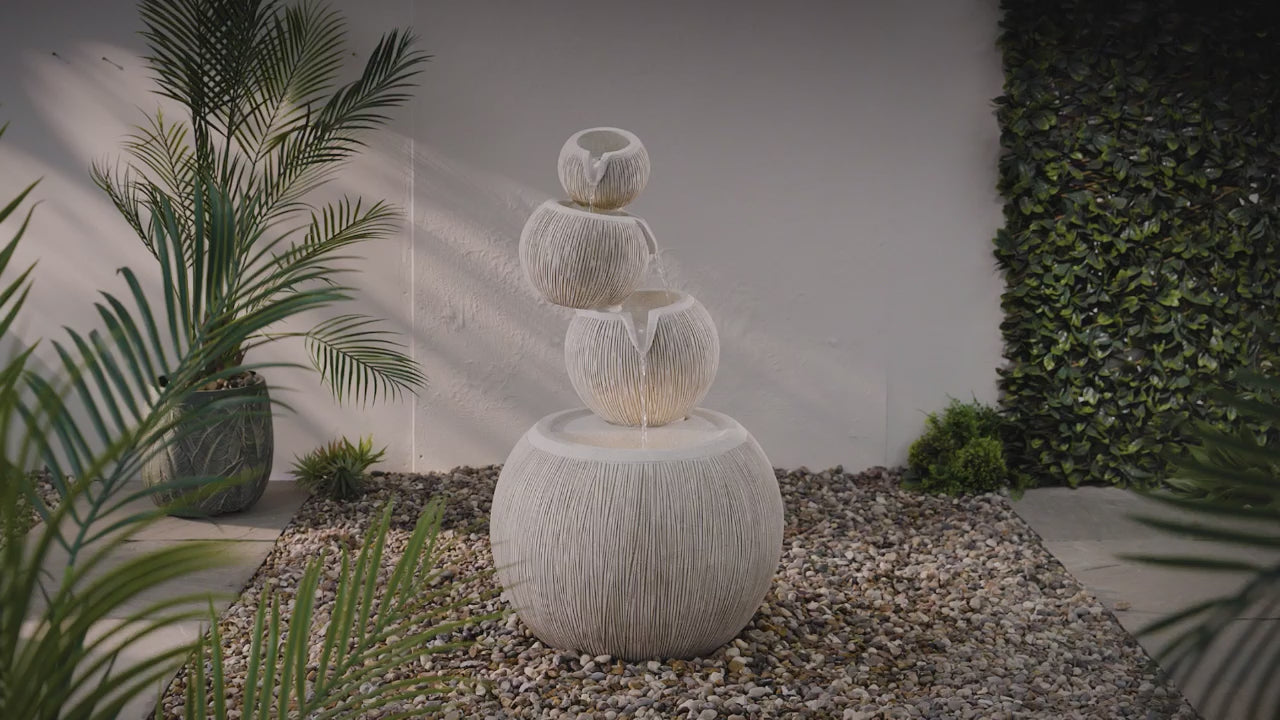 Our Poseidon is a stunning Greek inspired cascading, low maintenance water feature, with a softly illuminated stacked bowl design.