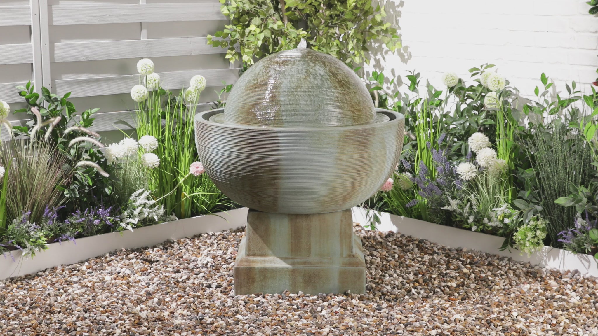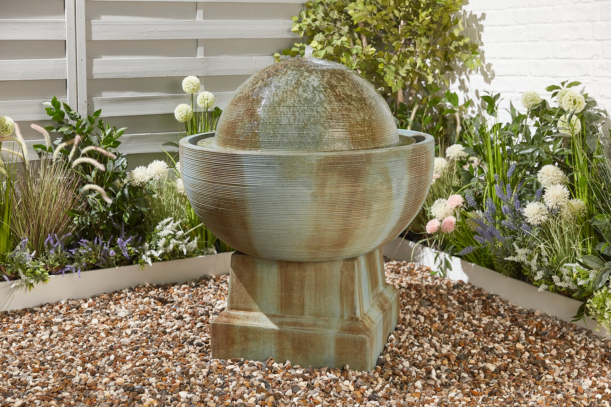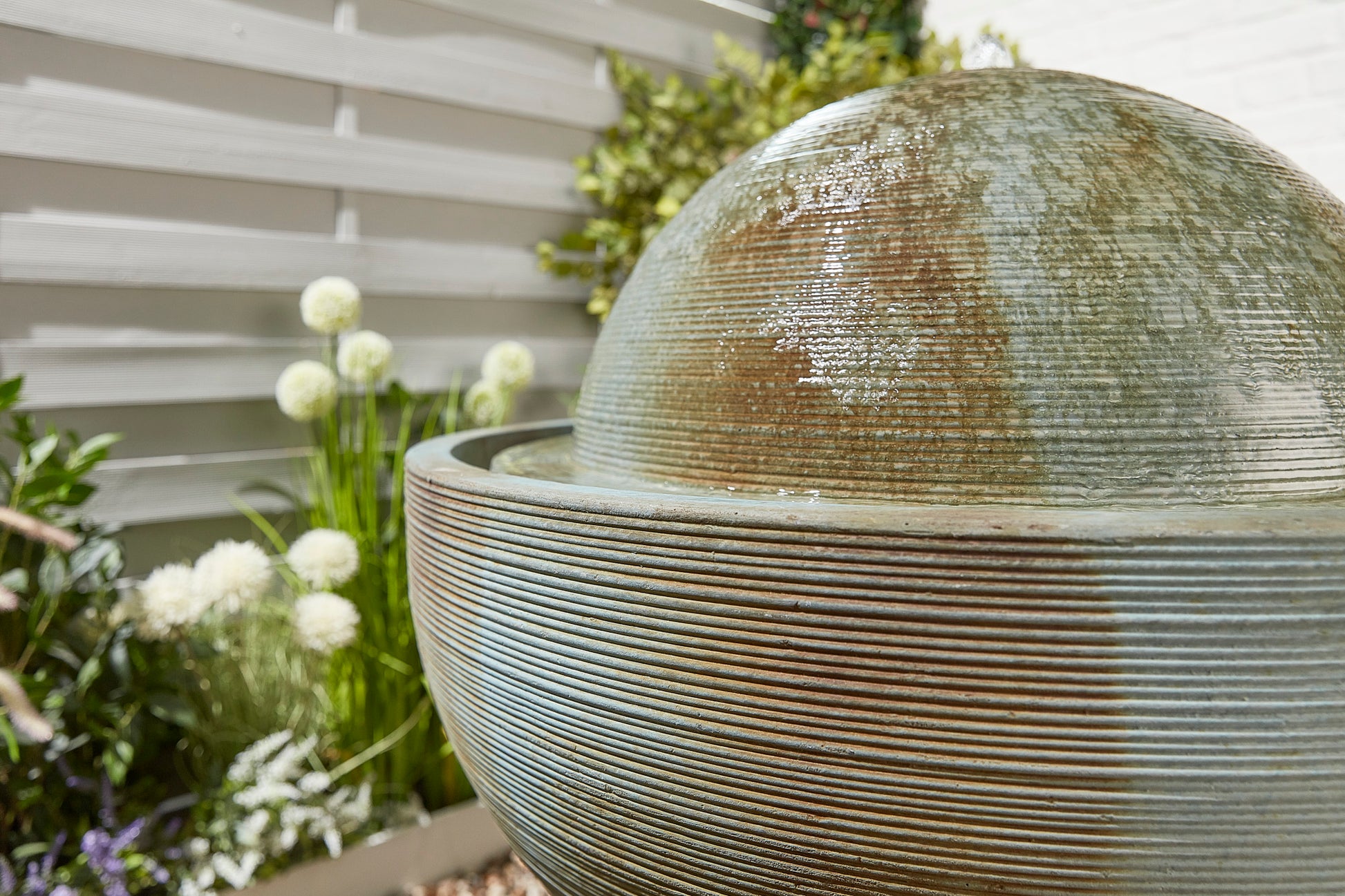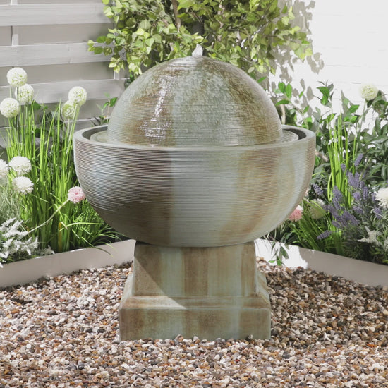 A real focal point with it's impressive stature and water that bubbles, then flows over the surface of the textured dome.